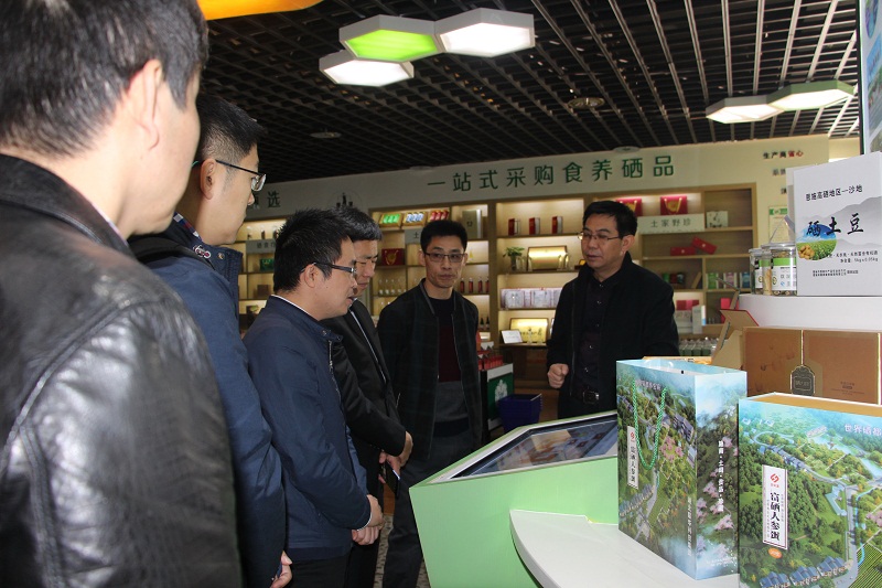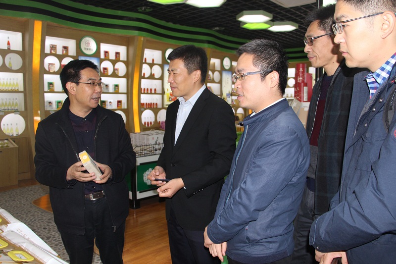 徕福硒业黄毅华董事长、运营总监杨爱明陪同黄福宁副州长、州金融办张绪华副主任、中粮集团公司领导(信托公司总经理助理张勇、农业金融部经理成伟等)参观徕福硒业硒品体验店(徕福硒业科技大楼1楼)