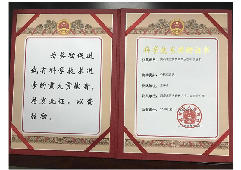 2017年11月9日,湖北省科技厅组织专家对恩施徕福硒业有限公司(原名巨鑫农业)承担的湖北省重大科技创新计划关键技术研发项目“高山蔬菜高效安全生产关键技术研发(项目编号:2014ABA034)”进行了现场验收,验收专家组听取了项目执行情况报告、考察了项目现场、审查了相关材料,经质询和讨论,对本项目研究开发完成的任务目标和所取得的科技成果表示认可,同意通过验收。