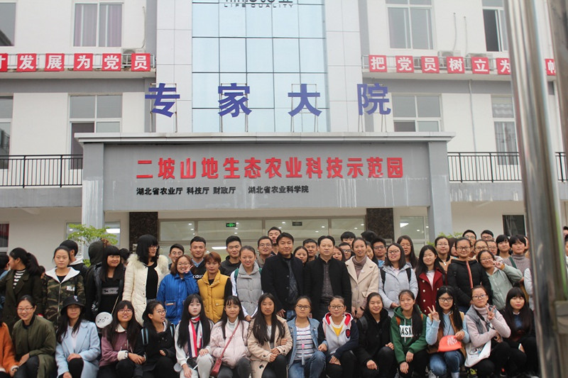 湖北民院林学园艺学院园艺系师生参观徕福硒业二坡农业科技示范园与专家大院(居中 左一徕福硒业二坡基地负责人陈国辉、居中右一湖北民院园艺系陈耀兵教授)